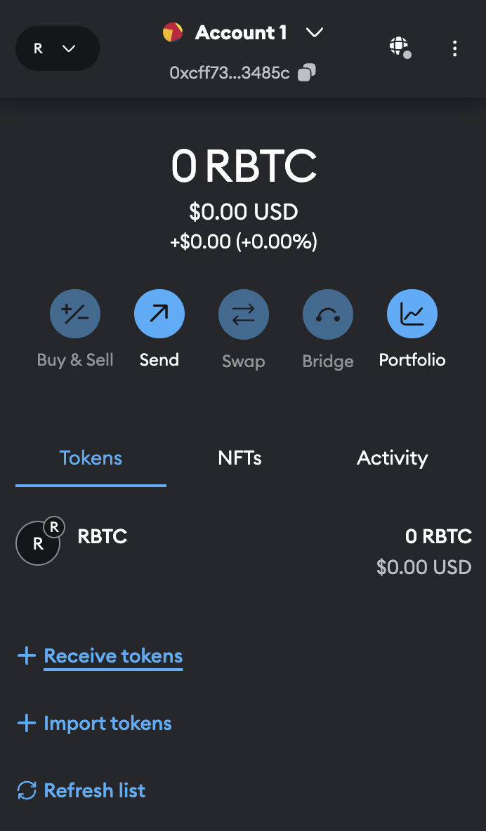 • Currency may be mistakenly displayed as ETH within some screens of MetaMask. The Rootstock network uses RBTC as its cryptocurrency.